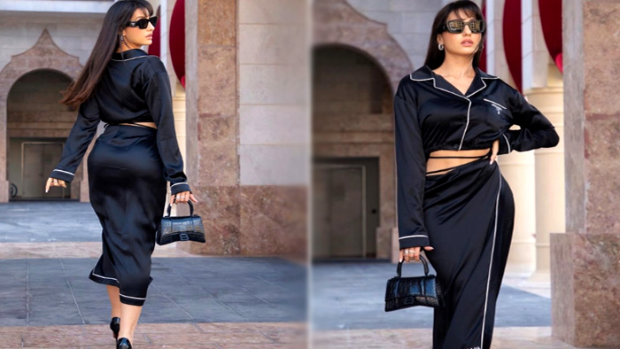 Check out how much her bag costs. Nora Fatehi’s skirt suit is stylish.