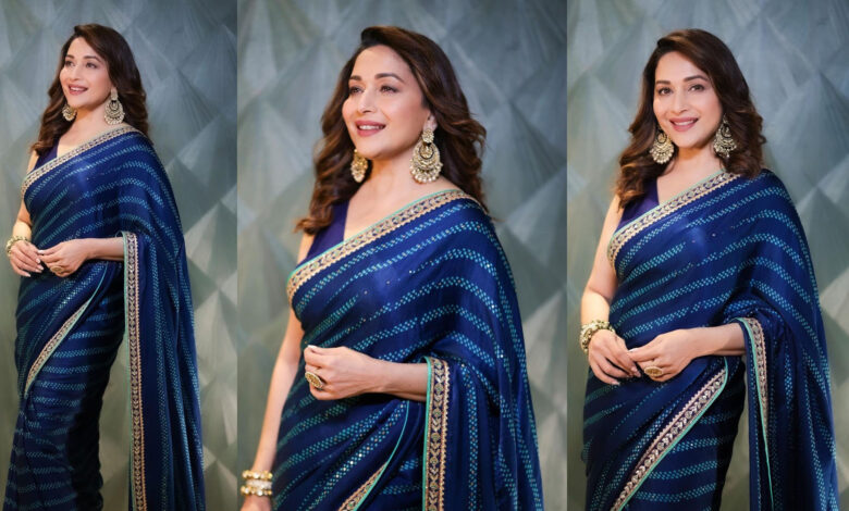 Madhuri Dixit is glowing and shining in a beautiful fusion saree.