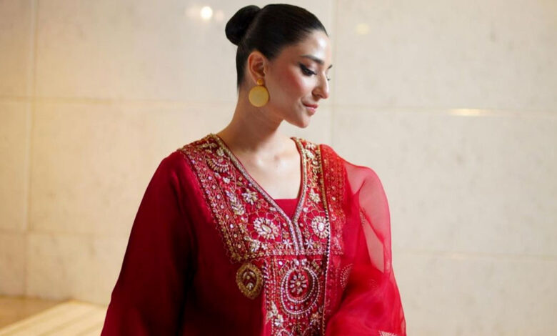 The vibrant red dress makes a bold fashion statement, exuding passion and glamour. The intricate design and attention to detail in the outfit highlight Ramsha Khan’s impeccable fashion taste. The color choice perfectly complements her complexion, adding to the overall impact of her appearance in the photograph.