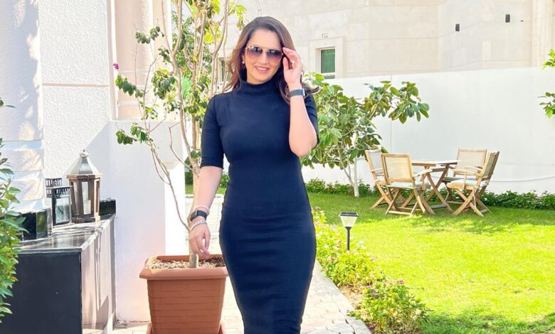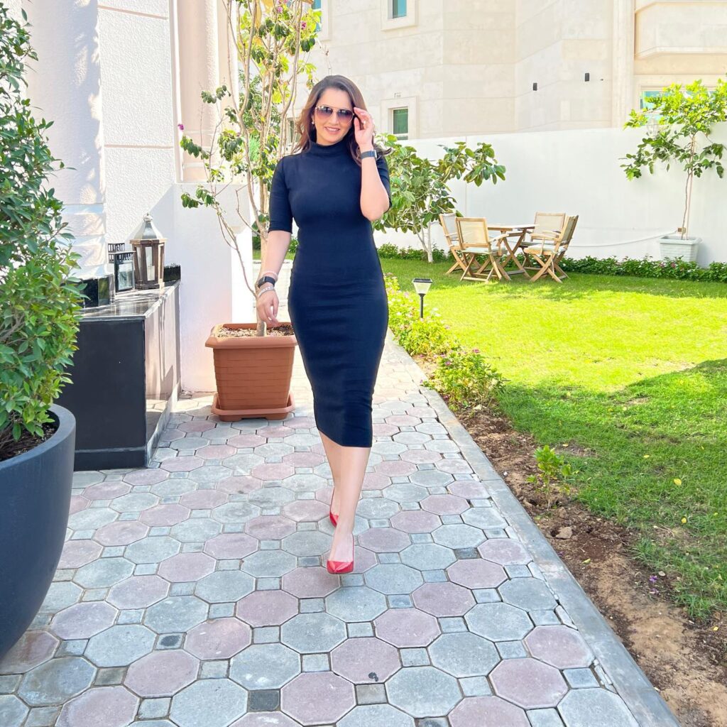 Sania Mirza looks beautiful in a navy bodycon dress.