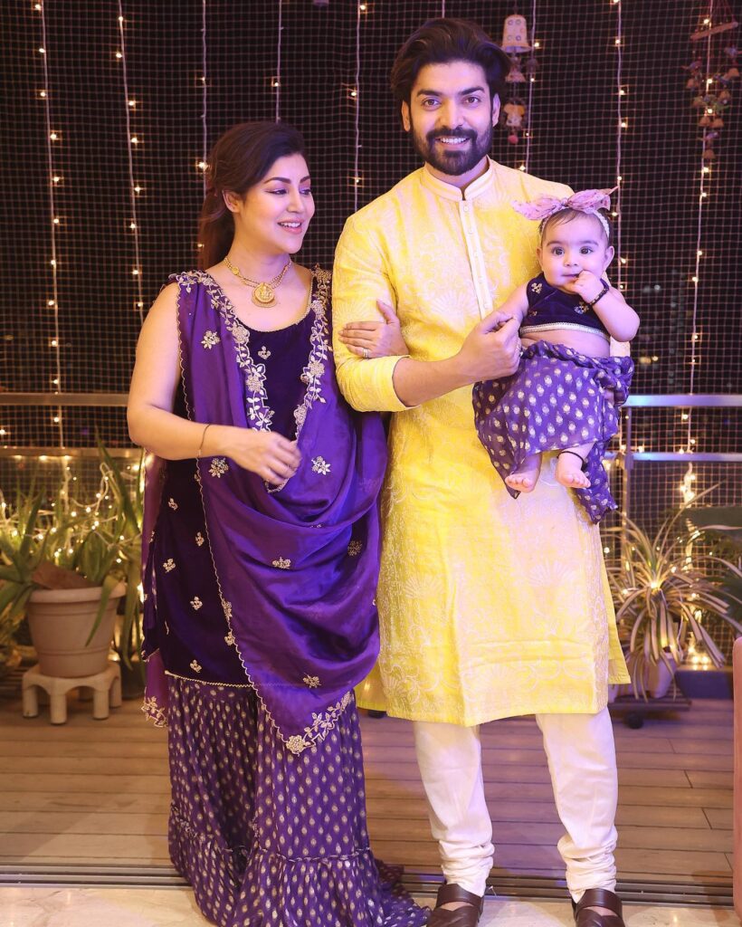 Debina wore a purple kurta sharara with a dupatta and a gold necklace. Gurmeet was wearing a yellow kurta, white pajama bottoms, and brown shoes. Lianna wore a purple crop top and skirt to look like her mother. She also wore a pink headband.