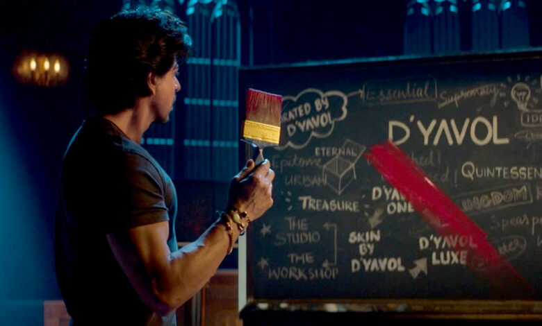 Then Shah Rukh Khan enters the room and draws another line with the brush, creating a cross on the board. This forms the official logo of the brand, D’yavol X.