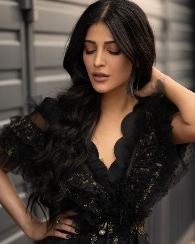 In the shared pictures, Shruti Haasan showcased her fashion prowess in a stunning black netted gown. The unique sleeves and her effortlessly messy hairstyle added an edgy touch to her look. With dewy makeup, nude lips, and a gothic-inspired appearance, she captured the attention of onlookers.